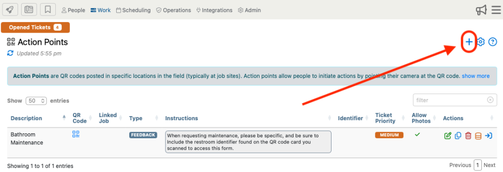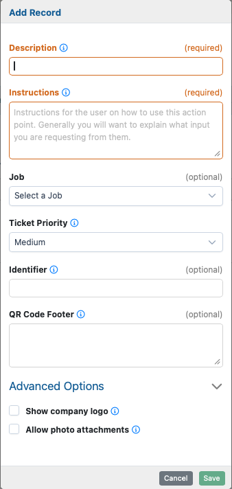 The name of the action point. Often times corresponds to a physical location. The description you enter will show up at the top of the printable QR code as highlighted here.