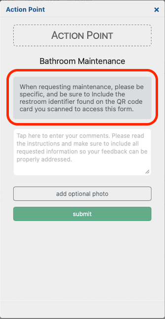 The instruction entered here will be displayed in the web form that opens when a user points their camera at the action point QR code and clicks the link. Here’s an example of what the user sees.