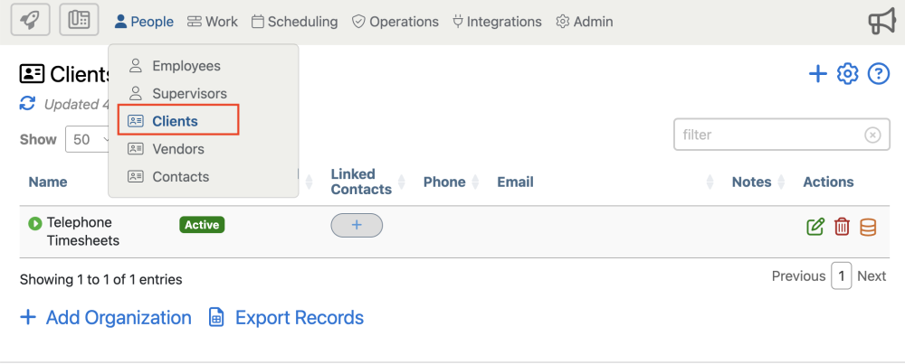 1. The clients page can be access from the “People” menu, then selecting “Clients” from the drop down.