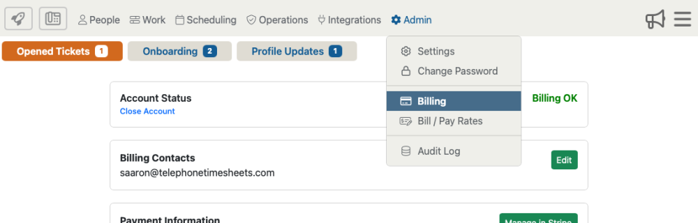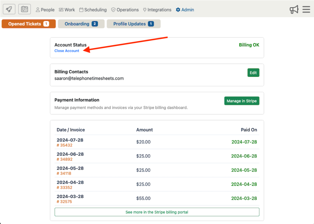 To close your account, you will click on “Admin” then “Billing” from the drop down menu.