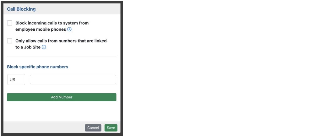 2. Block inbound calls from any number that is not explicitly linked to a job. If we see an incoming call from numbers that are not linked to a job, we will answer with “You are calling from an unauthorized number, please call from an authorized job site number” and then the call will be disconnected.