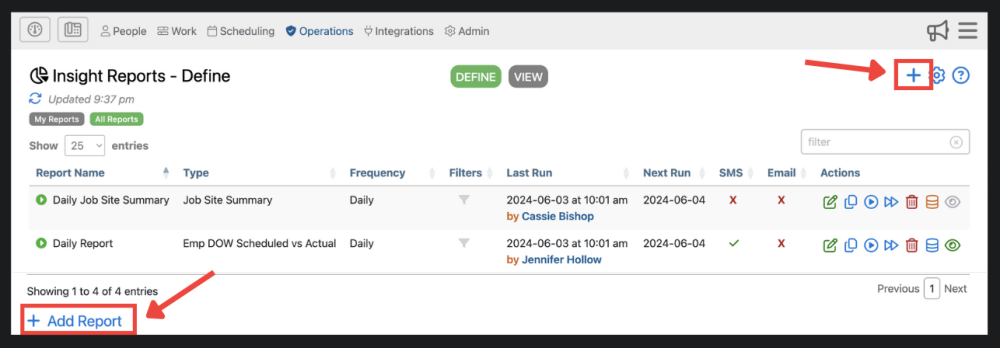 Report names should specify the use for that report, such as location, what’s being reported, and the reports fequency. For example, “Anderson Building Hours Weekly”