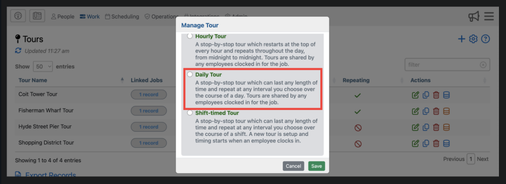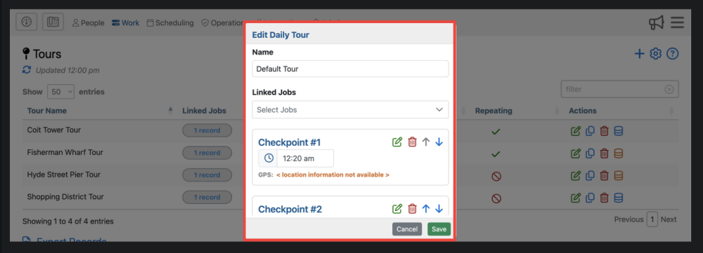 This opens up options much similar to hourly tours such as the name of the tour, the linked jobs, and the various checkpoints.