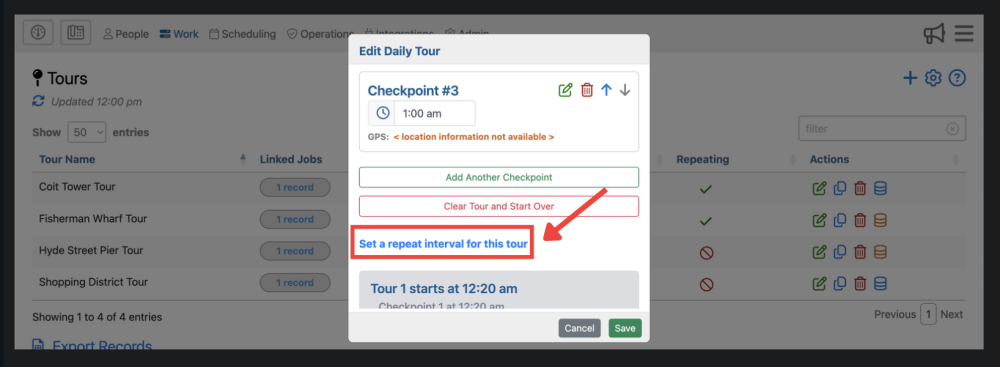 When you click on this, you will then have the option that allows you to determine how often the tour should repeat, thus creating how long that particular tour with your checkpoints will last throughout the day.