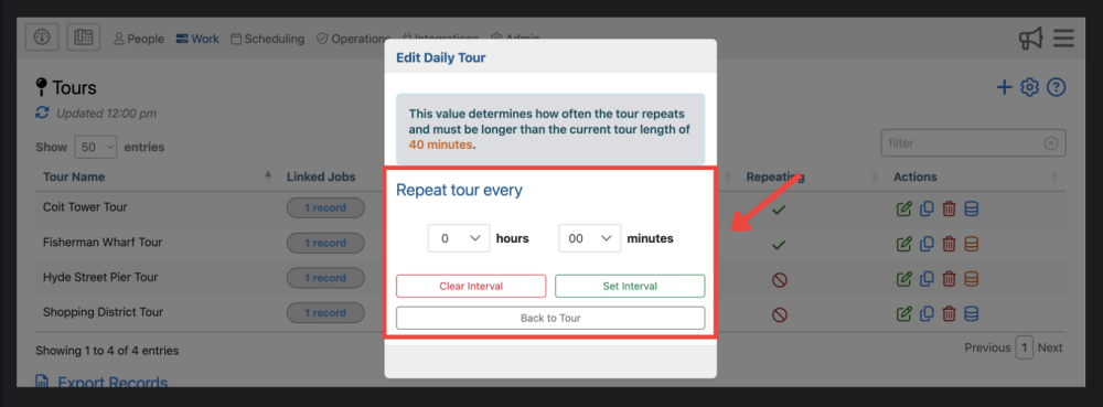 However, at the bottom of this form is an option to “set a repeat interval for this tour”.