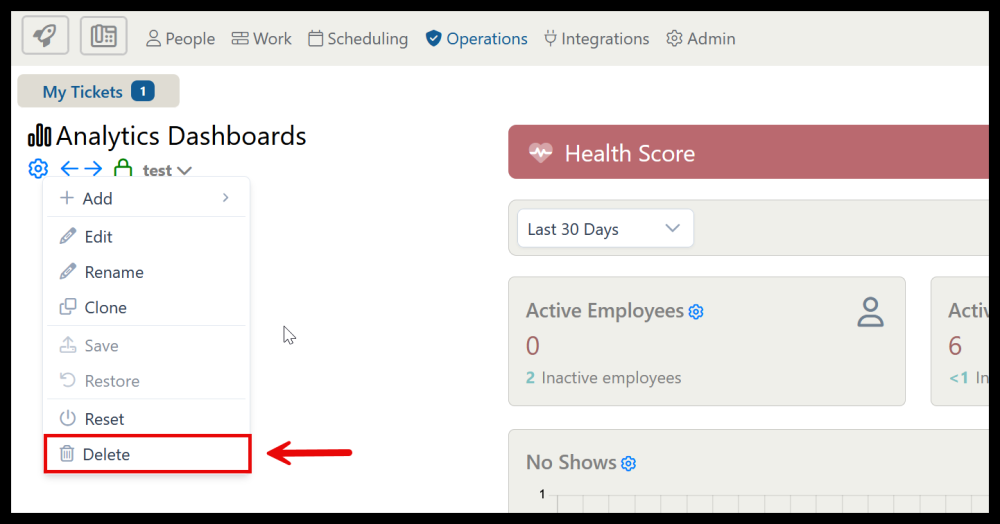 In the dashboard menu, select Delete to delete the currently selected dashboard.