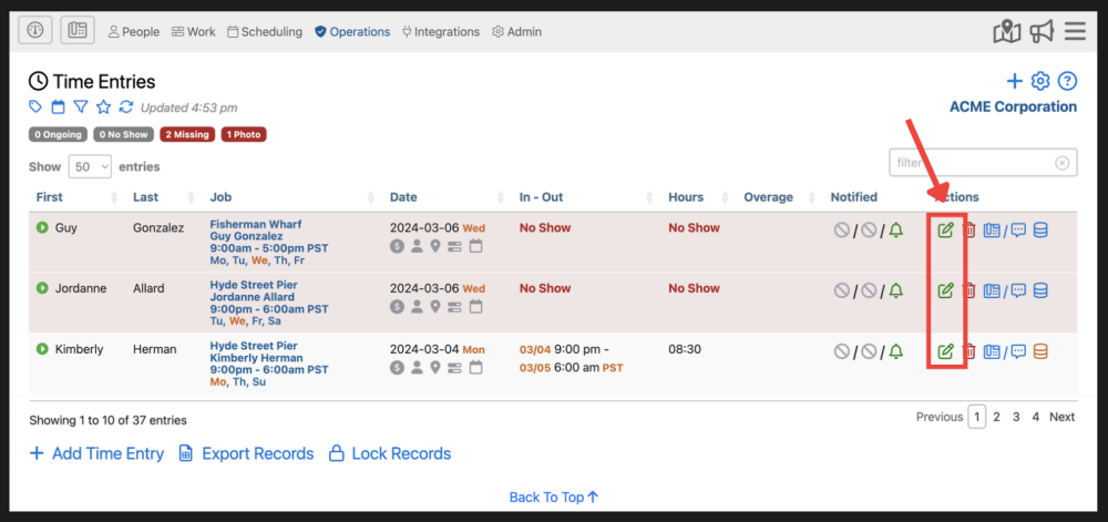 You can edit a time entry by clicking on the green edit button