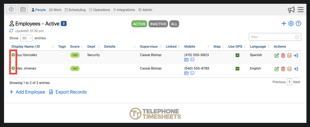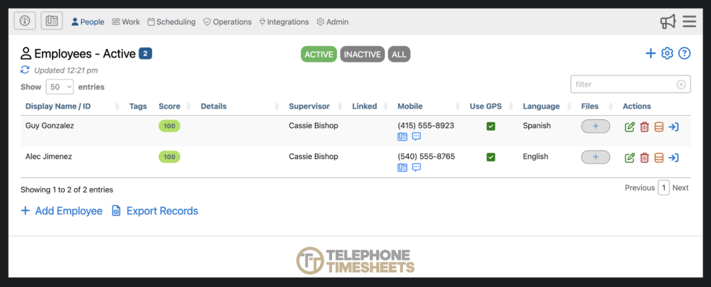 Telephone Timesheets can be used without ever entering any employee information. Employees can self-enroll the first time they call in. The system will determine their name, mobile number, and spoken language. English, Spanish, French, Chinese, and Russian are supported. Additional languages added on request. As a best practice, we recommend that you take the time to pre-enter your employees to make the first-call experience quicker and easier for them.