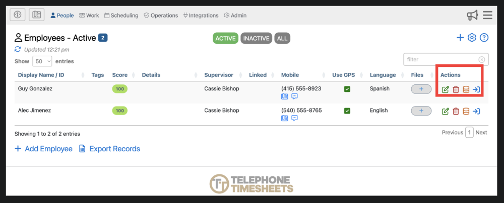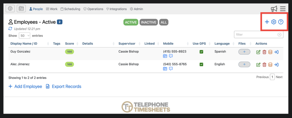 1. Employees are organized into 3 different categories; Active, Inactive, All. You can filter employees using these 3 tabs