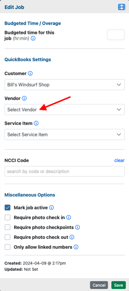 Note: Time entries for vendor-supplied employees (employees who are not synchronized with QuickBooks Online) can be exported to QuickBooks Online for use with customer invoices, just like you can do with direct employee time. Each time entry for a vendor-supplied employee will upload to QuickBooks Online including information about the vendor, and can then be imported into customer Invoices just like you can do with direct employees time entries. This only works if the job that a vendor-supplied employee has been associated with a QuickBooks Online Vendor as shown below.