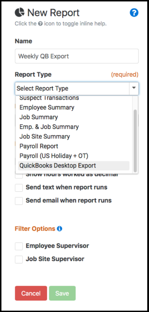 Exporting Time Entries from Telephone Timesheets is done through the Reports section of the administrative portal. In order to perform an export, simple create and run a report with the report type set to QuickBooks Desktop Export, as shown below.
