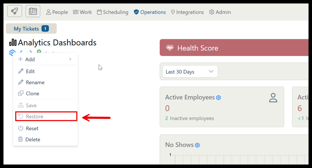 4. To restore a deleted card or graph, select restore in the Dashboard menu. This will restore the deleted card or graph.