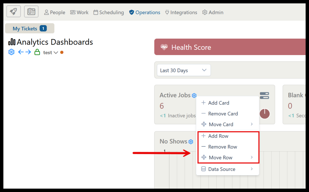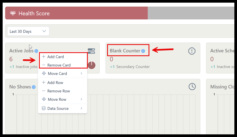 icon on any dashboard card brings up a menu with card options including adding and removing and adding a data source.