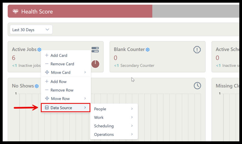 5. To add a specific data source to a card to be used for tracking/metrics, select Data Source.