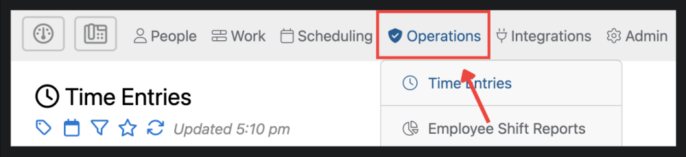 This top-level menu contains all of the sections related to the Operations involved in your business — Time Entries, Reports, Logs, and Announcements.