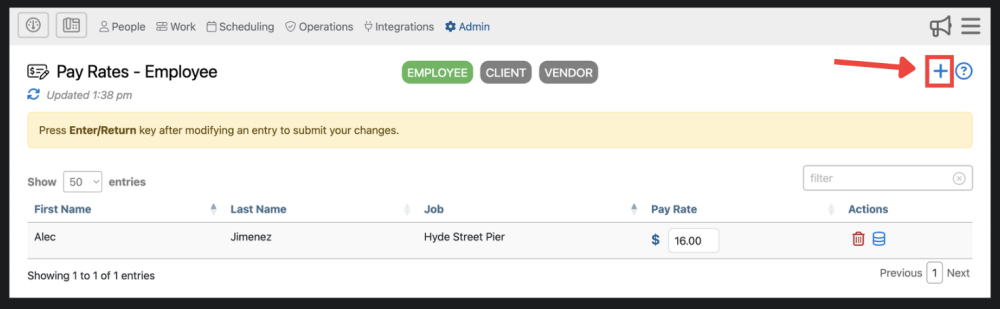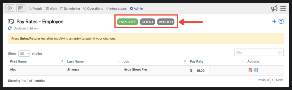 1. Bill/pay rates are organized into 3 different categories; Employee, Client, Vendor. You can filter bill/pay rates using these 3 tabs