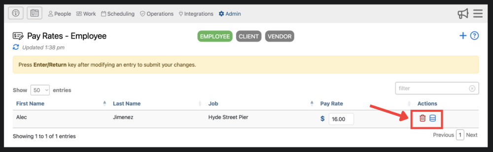 4. Here, you are able to edit the rate for any bill/pay rate record. Make sure you press Enter/Return to save your changes to the bill/pay rate.