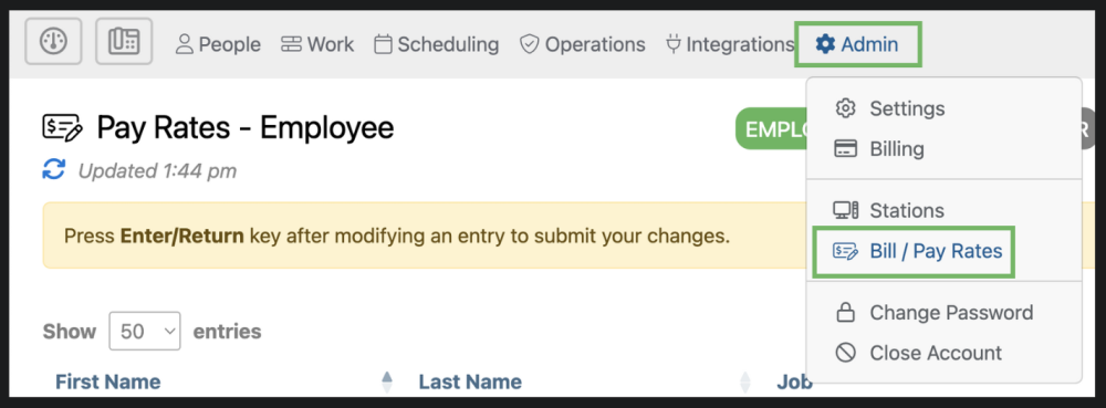 The Bill/Pay Rates page can be accessed by selecting “Admin” from the top menu and then “Bill / Pay Rates” from the drop down.