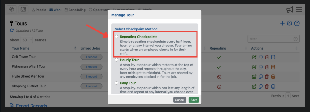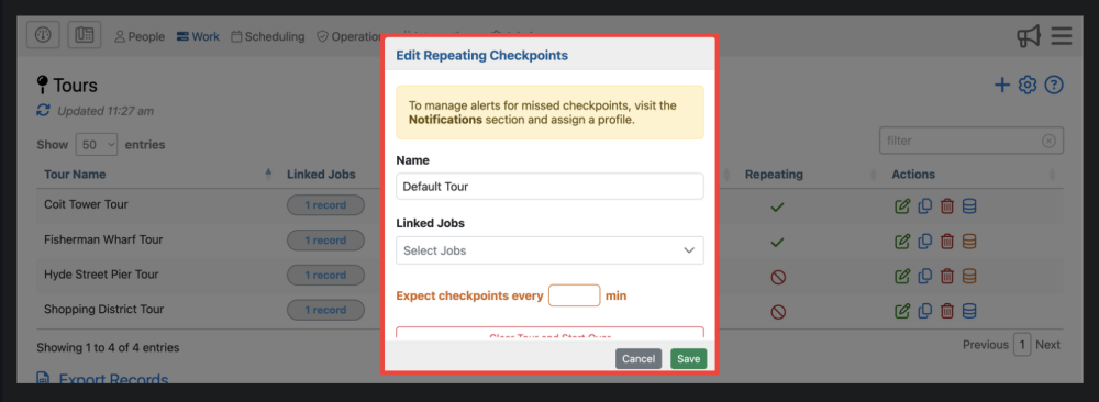Once you’ve clicked “Repeating Checkpoint” you’ll then be brought to a form. Simply fill out the name of the tour, the job it applies to, and when to expect checkpoints.
