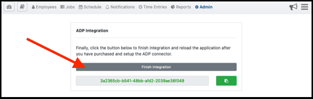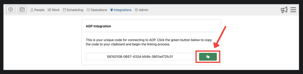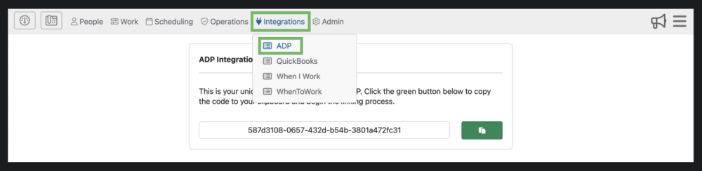 Step 2: Open a new tab in your browser and go to the ADP page in Telephone Timesheets under Integrations —> ADP as shown here.