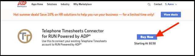 Step 5: Click the “Buy Now” button at the top of the ADP Marketplace listing for the Telephone Timesheets Connector. Note: ADP charges 50 cents per user. Telephone Timesheets does not charge anything for integration to 3rd-party systems. Ever.