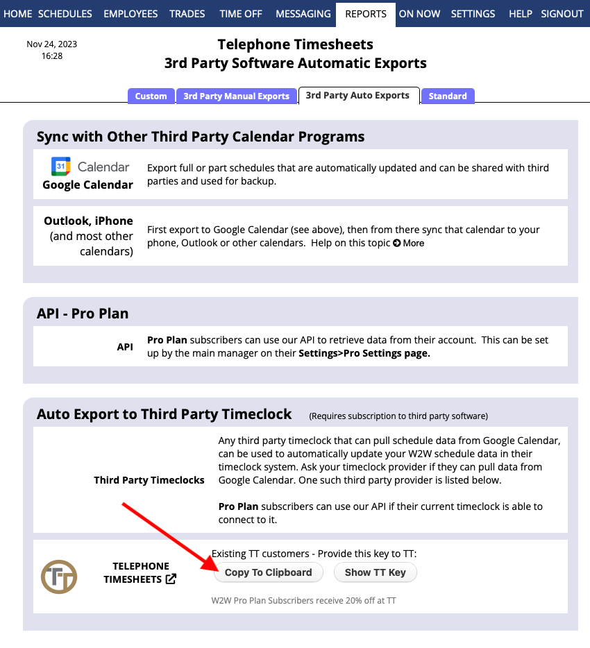 To obtain the key, login to the WhenToWork administrative portal and click on the Reports —> 3rd Party Auto Exports menu as shown here.
