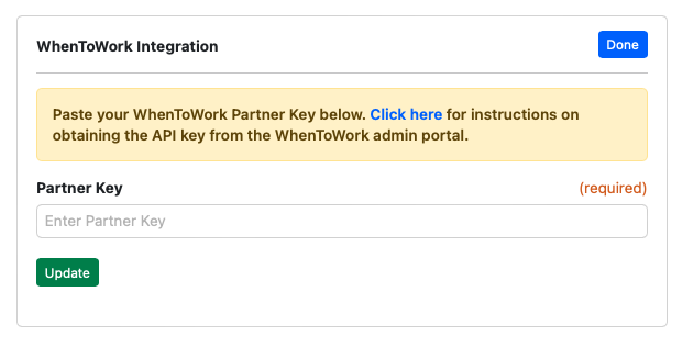 To paste the key into Telephone Timesheets, go to the Integrations —> WhenToWork page.