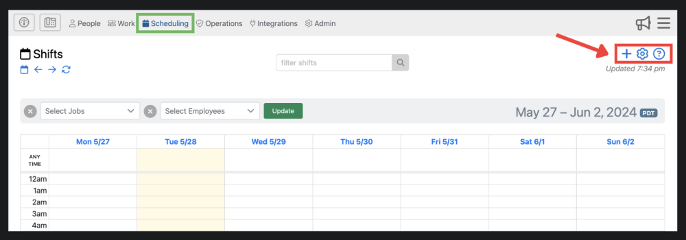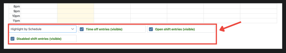 5. At the bottom of the shifts dashboard, you are able to toggle options to view time off entries, open shift entries, disabled shift entries, or view the different highlights assigned to employees, jobs, or schedules.