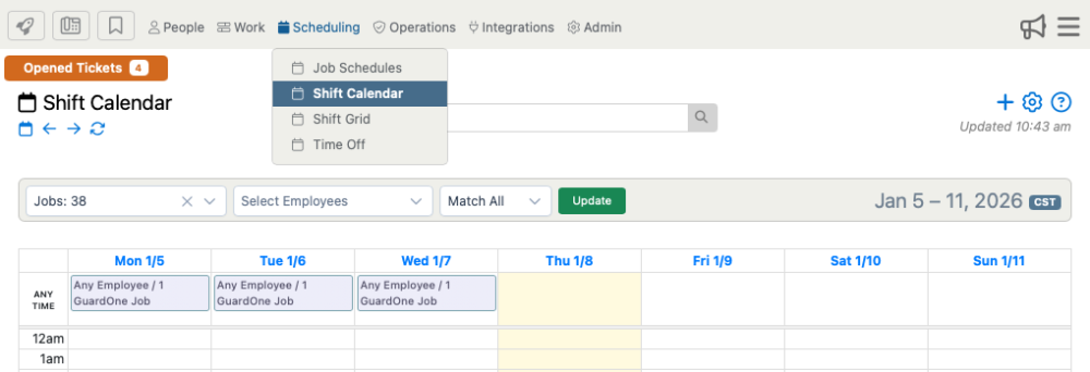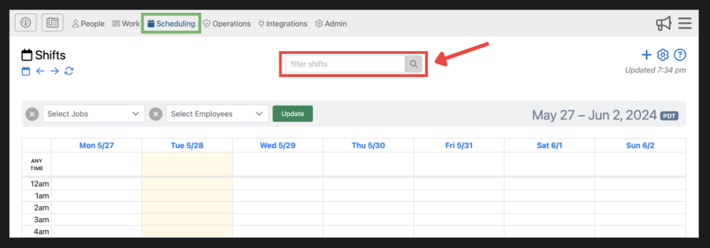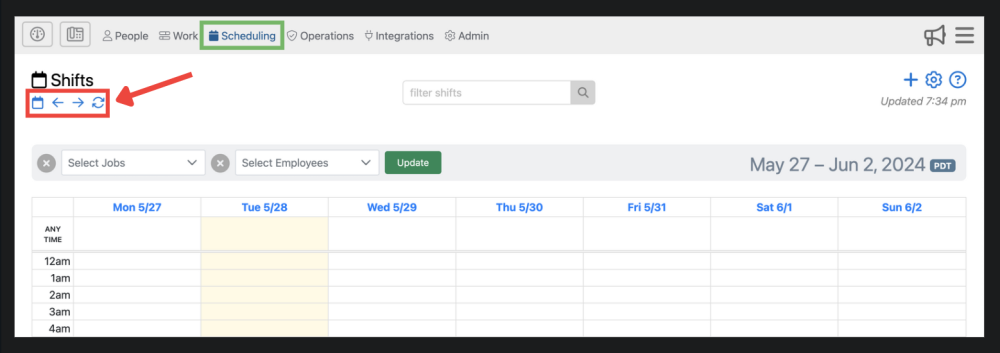 The shift calendar page can be accessed by selecting “Scheduling” from the top menu and then “Shift Calendar” from the drop down. The shift calendar page is designed to give admins a 7-day work week view or a daily view of their job schedules. The view can be filtered to only display specific employees or specific jobs, or some combinations of the two.
