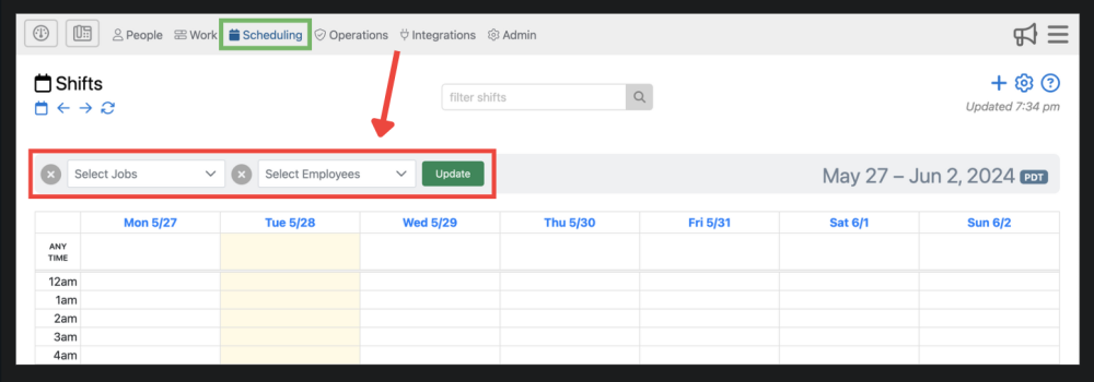 4. The drop down menus allow you view shifts pertaining to a specific job or employee.