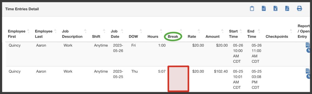 Break violations will be highlighted in red in any reports that include Time Entry detail rows (e.g. Time Entries Report, Employee Summary Report, etc.)