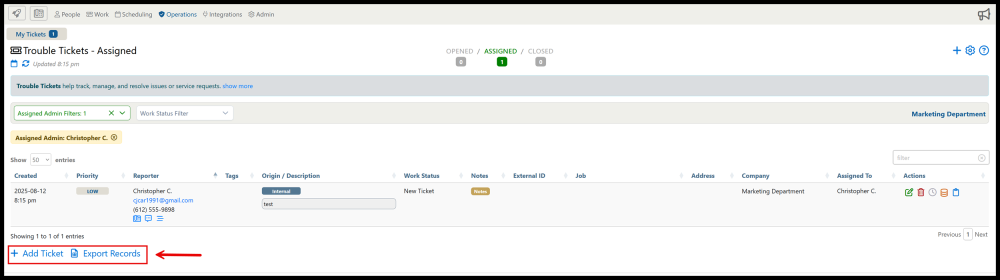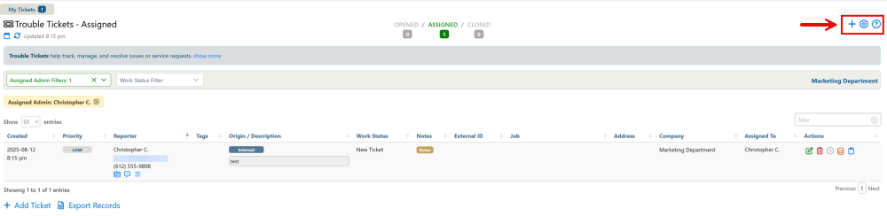 The Trouble Tickets section of the portal is where tickets can be created and assigned to worked. It contains a filterable view that can be sorted based on ticket properties.