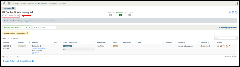 and refresh the Trouble Tickets page