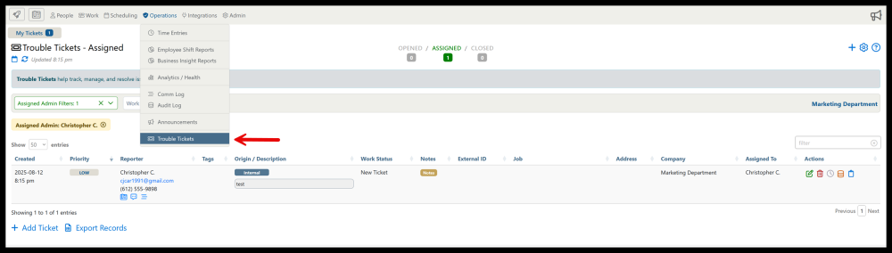 The Trouble Tickets page can be accessed by selecting “Operations” from the top menu and then “Trouble Tickets” from the drop down.