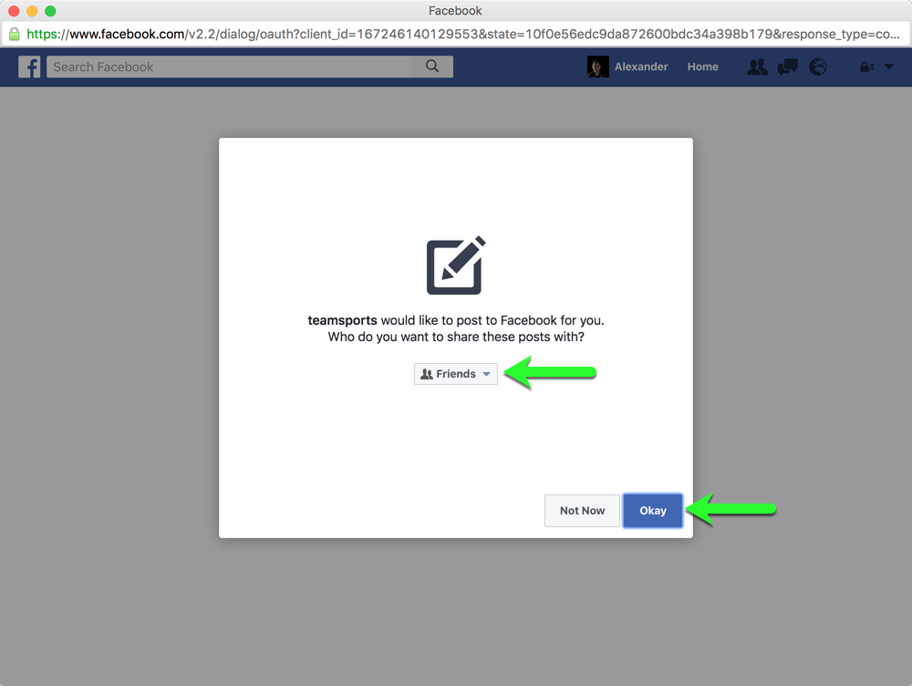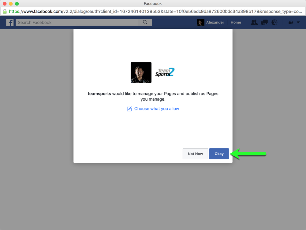 Damit Facebook Connect funktionieren kann, musst du TeamSports 2 zuerst einmal die Erlaubnis erteilen, auf der Facebook Seite deines Vereins zu posten. Wie du dies machst, bekommst du im Folgenden erklärt.