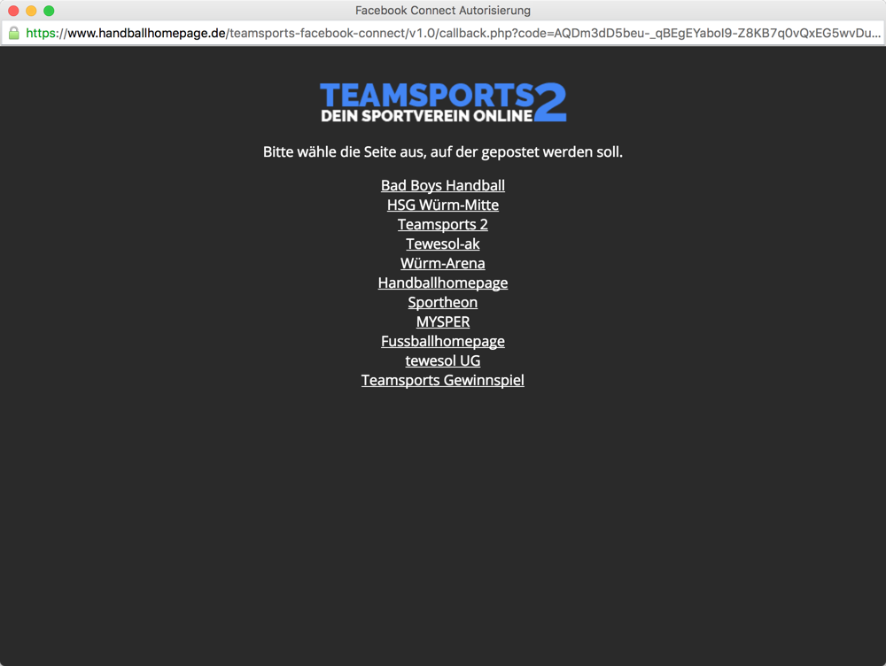 Als Letztes bekommst du eine Liste von allen Seiten, die du auf Facebook verwaltest. Wähle hier die Seite aus, die mit dem System verknüpft werden soll. Auf dieser Seite wird TeamSports dann deine Beiträge veröffentlichen. Nach dieser Auswahl bekommst du noch eine Erfolgsmeldung und kannst das Fenster schließen.