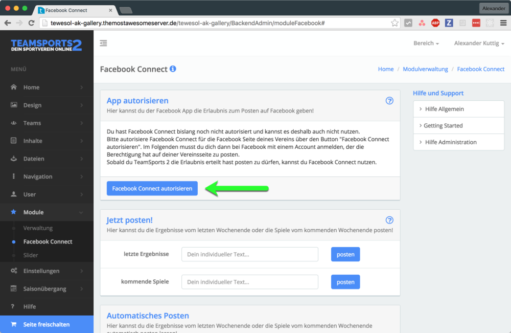 Wenn Facebook Connect aktiv ist (Module), findest du im Bereich Administration unter dem Navigationspunkt Module den Punkt “Facebook Connect”. Hier klickst du auf den Button “Facebook Connect autorisieren” (siehe Bild 1 grüner Pfeil).