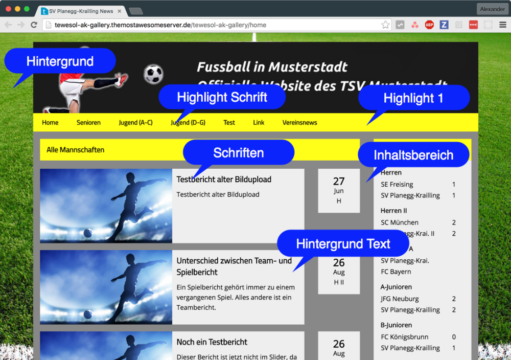 Du solltest auf jeden Fall darauf achten, dass der Kontrast zwischen Schriften und Hintergründen groß genug ist, um die Schriften leicht lesen zu können. Es ist auf einer Homepage enorm wichtig, dass die Inhalte angenehm zu lesen sind.