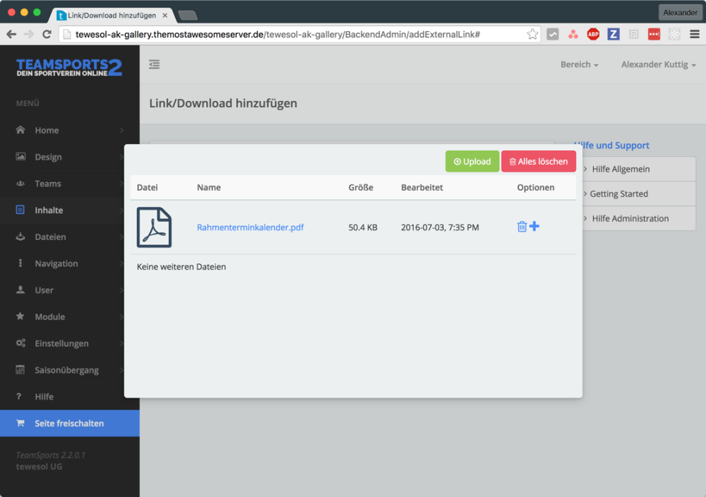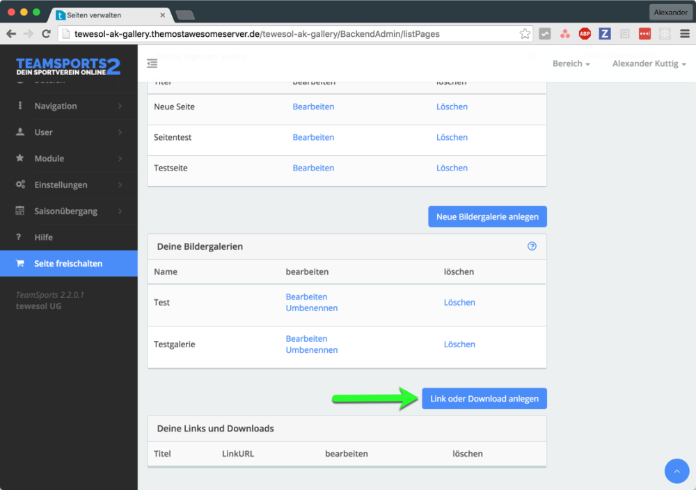 Im Bereich Administration unter dem Navigationspunkt Inhalte kannst du einen neuen Link oder einen neuen Download anlegen. Dieser Link oder Download wird dann deiner Navigation hinzugefügt. Deine angelegten Links/Downloads findest du unten auf der Seite (in der dritten Tabelle). Über den Button “Link oder Download anlegen”, gelangst du zur Eingabemaske in der du den Link oder Download anlegen kannst (siehe Bild 1 grüner Pfeil).