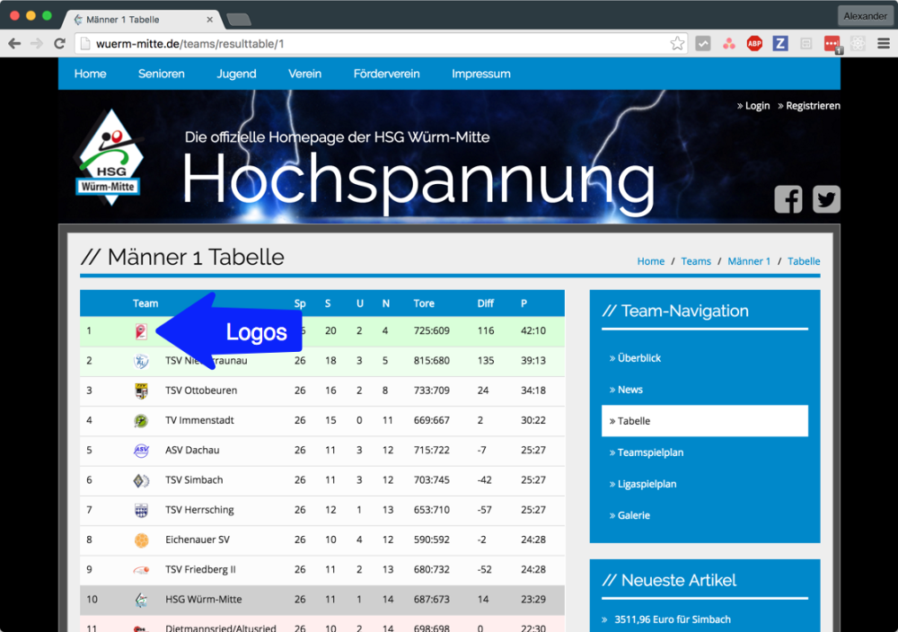 Die Logos werden für die gesamte Website zentral verwaltet. Sie können im Administrationsbereich unter Design -> Vereinslogos hochgeladen werden. Dabei ist unbedingt auf eine korrekte Vergabe des Namens zu achten. Der Name des jeweiligen Vereins muss exakt so geschrieben werden, wie im Ergebnissystem angegeben, sonst kann eine korrekte Zuordnung nicht garantiert werden.