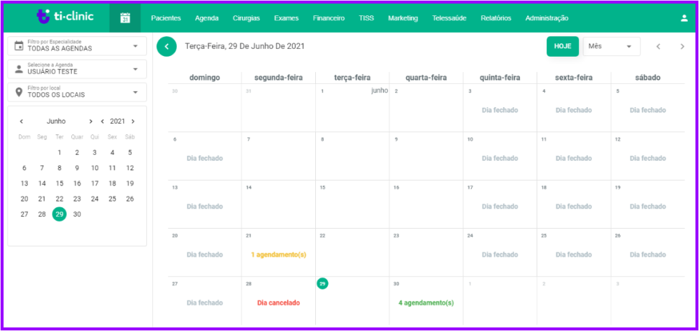 4. Selecionando visualização por mês, os agendamentos serão mostrados desta forma: