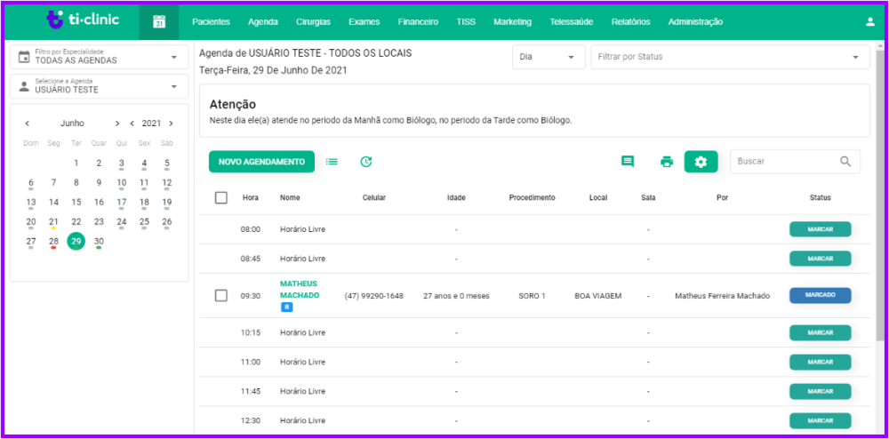 - No horário agendado dispõem as informações de nome do paciente, celular, convênio, procedimento agendado, local de atendimento, sala, usuário da plataforma que efetuou o agendamento, e status do agendamento.
