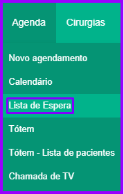 Para adicionar pacientes a listas de espera já criadas, e utilizá-las para auxílio no agendamento, clique em “Agenda” nas abas acima, e então em “Lista de Espera”: