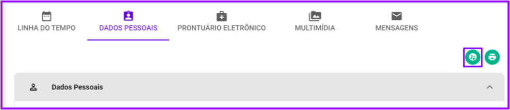 1. A ferramenta pode ser encontrada na tela de “Dados Pessoais” do paciente, so podendo ser utilizada por um perfil Administrador da clínica: