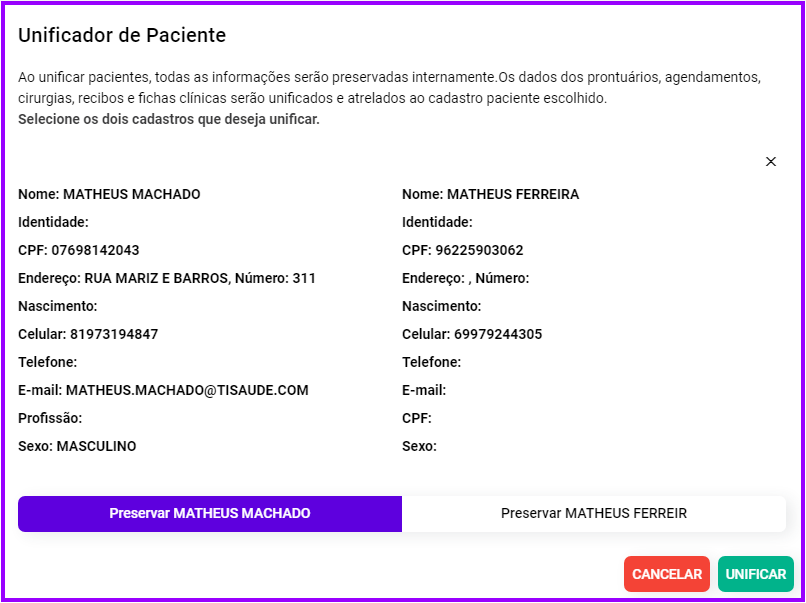 - Abaixo selecione qual paciente será preservado na plataforma, com todos os dados de agendamentos, prontuários, recibos, etc., do paciente unificado.