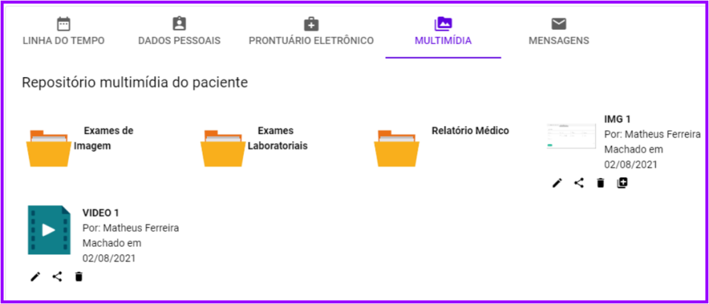 Todos os arquivos de multimídia anexados ao pacientes ficam nessa aba, com diversas funcionalidades: