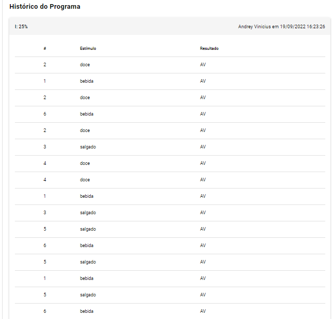 A fim de acompanhar como está a evolução do paciente, a plataforma disponibiliza um histórico no qual são mostrados: Números de vezes que o estímulo foi feito, quais estímulos foram testados e qual o resultado obtido por tal estímulo.