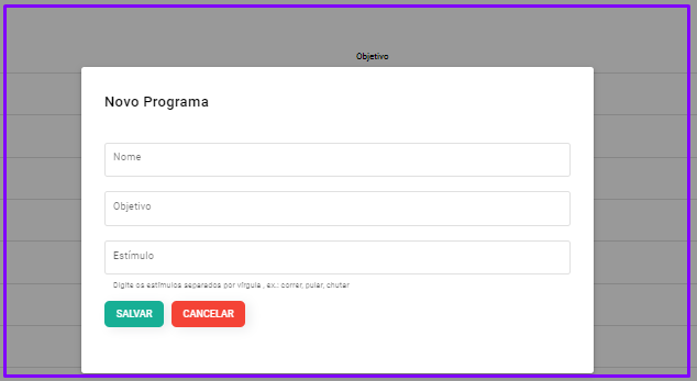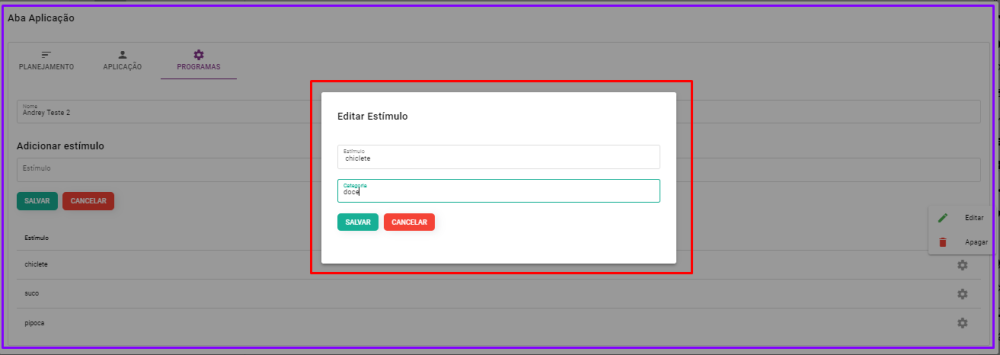 Nessa área, configuramos: O nome do procedimento, qual objetivo do procedimento e quais estímulos serão aplicados nesse procedimento. Lembrando que os estímulos devem ser separados por vírgula.