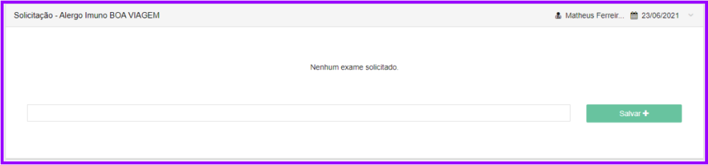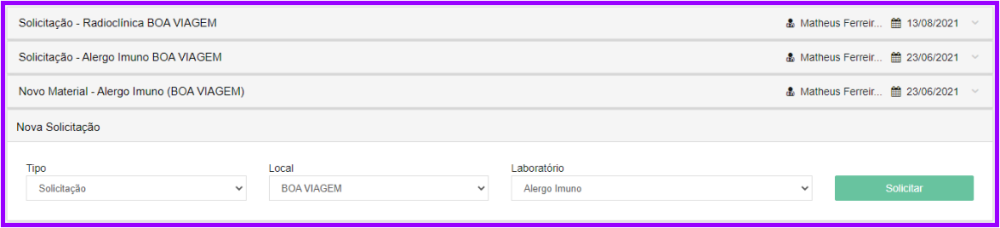 - Uma aba nova criada para cada tipo de solicitação feita, mostrando a data da sua criação e o profissional de saúde responsável.