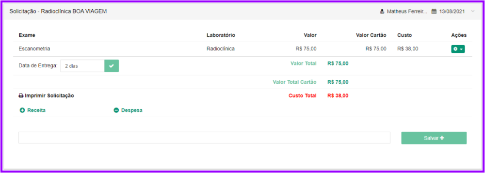 3. Adicionado um exame/material, suas informações aparecerão como valor, custo, e data de entrega: